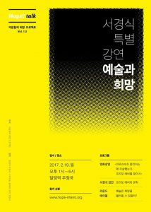 서경식 특별 강연 《예술과 희망》 일시 : 2017년 2월 19일 일요일 오후 1시 – 6시 장소 : 탈영역 우정국 (마포구 독막로 20길 42 ) 주최 : 의문형의 희망 프로젝트 협력 : 탈영역 우정국, 나무연필, 돌베개, 반비, 현암사 의문형의 희망 프로젝트는 “불안한 시대를 살아가는 인간에게 유효한 예술의 힘이란 어떤 것인가?”라는 물음을 던지며 2016년 시작한 예술 프로젝트로,